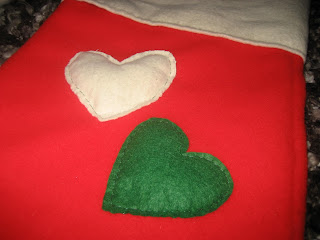 I made them with red fleece material, with a cream thick sock edging around the top. They're massive - but that means all the more presents to be stuffed inside!!
